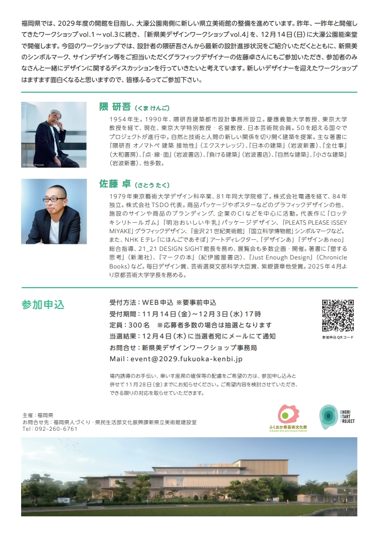昨年に引き続き、新県美の設計について県民の皆さんと共有する「新県美デザインワークショップvol.4」を、12月14日(日)に大濠公園能楽堂で開催します。